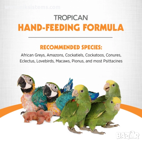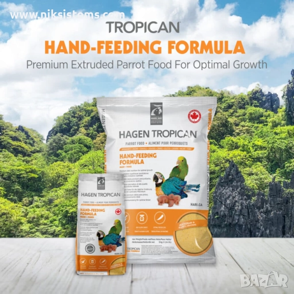Формулата за ръчно хранене Tropican осигурява правилно ежедневно хранене за малки папагали до излитането им, което е критична възраст от живота на папагала. Фино смляната екструдирана формула, която е лесна за смесване, се смесва безпроблемно с гореща вода, за да се получи гладка и консистентна каша без бучки. Това прави приготвянето бързо и лесно, подобрява храненето и засилва храносмилането. Тя е отличен източник на мазнини и протеини, получени от фъстъци, както и източник на 8 основни зърнени храни, които допълват аминокиселинните профили; всички от решаващо значение за правилния растеж и благополучие на пилетата папагали.