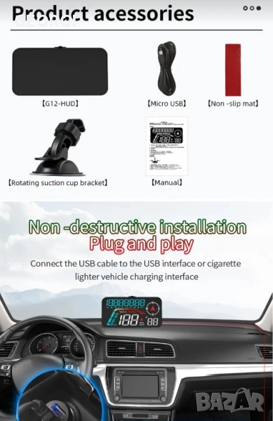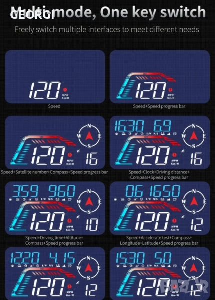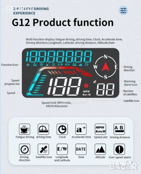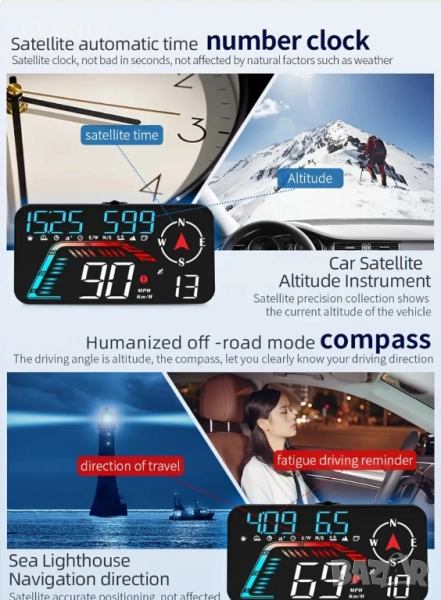 【Представяне на продукта】Това е интуитивен head-up дисплей за кола. Той може да показва данните за автомобила и шофирането на екрана, да се актуализира в реално време и данните да са точни. Може да се инсталира навсякъде, където е лесно да се виждат данните, което е много удобно. Намалете броя пъти, когато поглеждате надолу към данните, и избегнете много рискове за безопасността. Head-up дисплеят за кола ви придружава по време на пътуване. 【Принцип на работа】Този продукт е GPS система за автомобилен head-up дисплей, подходяща за всички автомобили, без проблеми със съвместимостта. Когато използвате USB кабела, предоставен в кутията на продукта, за да свържете продукта към автомобила, той ще започне да търси сателитни сигнали. Когато иконата на сателита спре да мига, продуктът ще започне да актуализира данните ви и ще работи нормално. Той работи, като търси сателитни сигнали. Ако търсенето на сателити е бавно, можете да шофирате с колата си до открито място, за да търсите сигнали. 【Функция на продукта】Този продукт има различни функции, като например: скорост, разстояние на шофиране, посока, брой спътници, напомняне за превишена скорост, напомняне за умора при шофиране. Можете да настроите екрана по ваш вкус, за да се показват една или повече функции. 【Външен вид и дизайн】 Този продукт е щателно изработен от швейцарски дизайнери. Корпусът е с голям екран, семпъл дизайн и матово покритие. В горната част на устройството има бутон за превключване на екраните и настройка. Освен това отпред има фоточувствителен отвор. Продуктът ще променя яркостта си в зависимост от промените във външната среда. По този начин, независимо дали е ден или нощ, можете ясно да виждате данните за продукта. Продуктът има USB конектор и зумер на гърба. Оборудван с вендузи и различни методи за монтаж, той е много удобен.