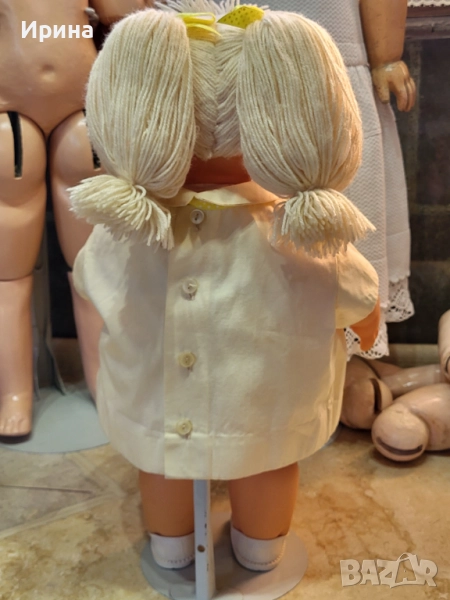 Колекционерска кукла Cabbage Patch Kids 46 см. Винилов материал. Меко-пълнено тяло. Напълно оригинално. Това е много рядка кукла, тъй като повечето имат изцяло платнени тела. Куклите са създадени от Ксавиер Робъртс. Името се превежда като „Деца от зелевата леха“. Стойката не е включена, но е налична в обявите ми за 25 лева.