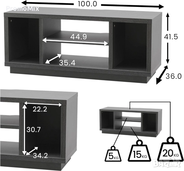 TV шкафът е подходящ за телевизори с диагонал до 43 инча и тегло до 20 килограма.