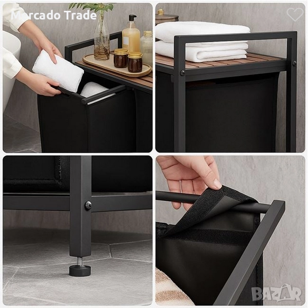 Кош за пране с черна метална рамка, черен полиестерен оксфорд плат, който е прикрепен към рамката с лента за закрепване между чатали. Кошът се изважда от рамката, за да се поставят дрехи. Отгоре има дървен рафт за организиране на перилни препарати или продукти за лична хигиена.