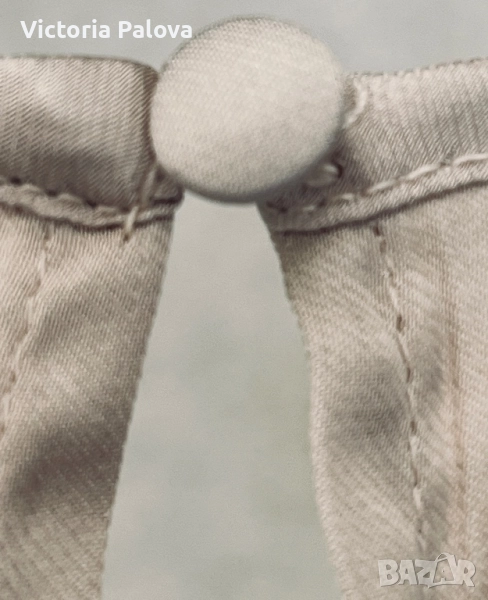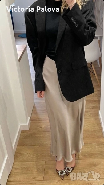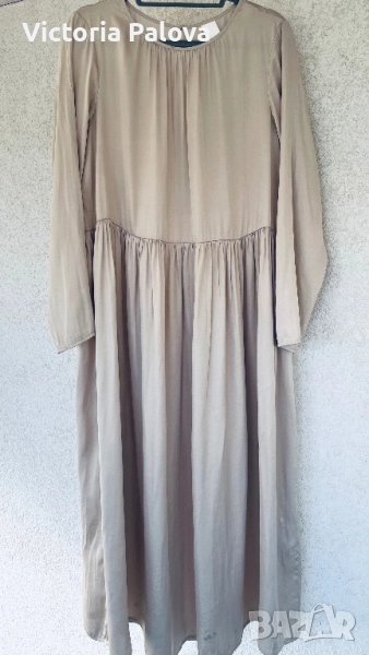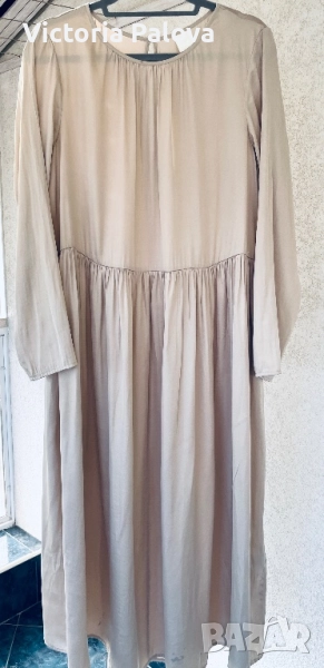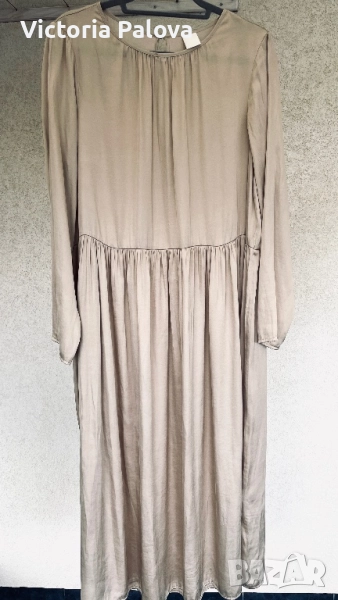 Оригинална рокля H&M, размер М, подхожда и за L. Материята е полиестер - лека,пада свободно и стои много красиво. Дизайнът е с присборена талия и дълъг ръкав, което я прави подходяща както за ежедневието , така и за по- официални поводи ( с черно сако). Универсалният бежов нюанс е лесен за съчетаване и придава стил и класа без усилие. Долу има няколко дребни петънца, но поради присборената материя не се забелязват. Рамо - 42см, ГО - 58см, шев по талия - 58см, дължина - 126см., разрез на гърба с фино облечено копче,