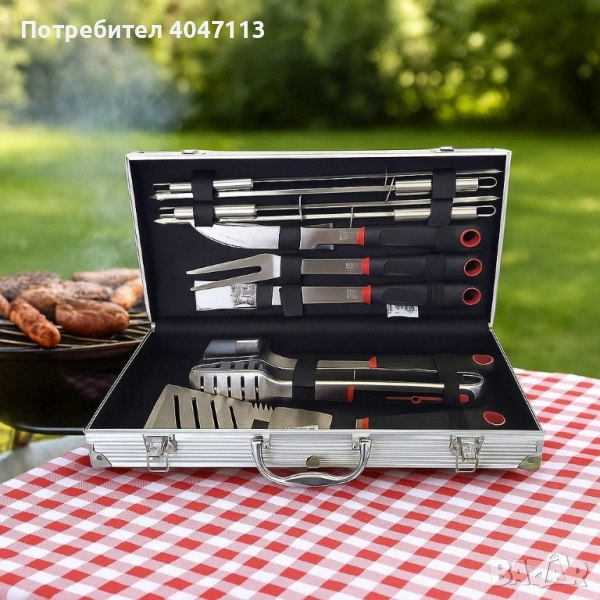 Продукт: Комплект от 11 инструмента за барбекю в куфар; Основен проблем: Липса на подходящи, здрави и подредени инструменти при приготвяне на барбекю; Решение: Пълен сет от 11 устойчиви на топлина и износване уреди, събрани в удобен куфар; Функции: Шпатула, щипки, четка за нанасяне, вилица, готварски нож, 4 шишчета, четка за почистване; Допълнителни ползи: Здравина от неръждаема стомана, лесно почистване, удобен за съхранение и транспорт, стилен подарък.