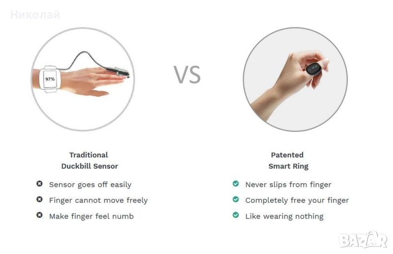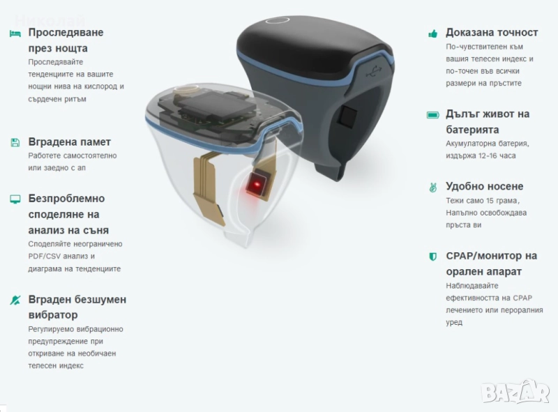 - Непрекъснато наблюдение/запис на SpO2 и пулса без външен сензор за пръсти