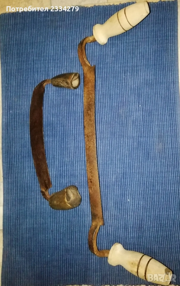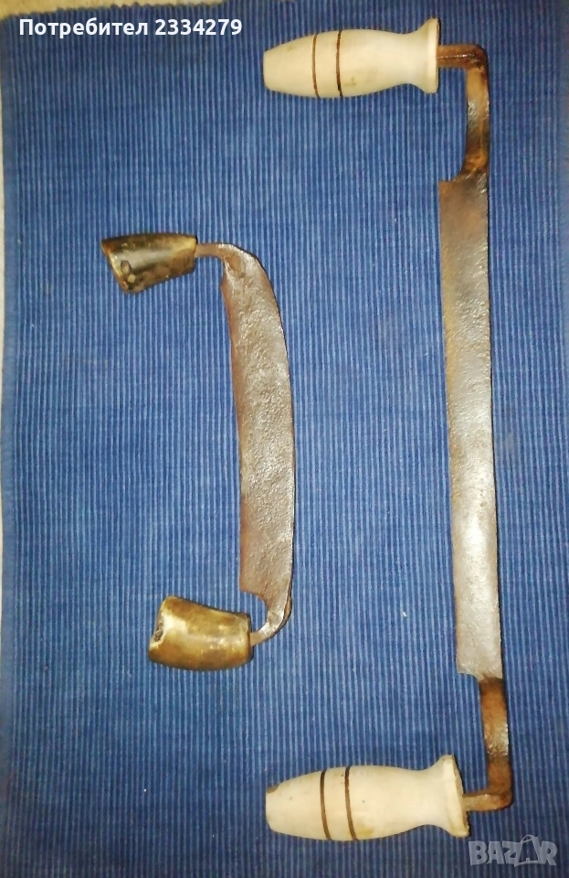 N:1стар ръчно изкован сатър с дървена дръжка и дупка за закачане, изработен през 40-те, размери цяла дължина 31см., острието 18х6см., дебелина 5мм., цена 13€.; N:2 стар овчарски касапски нож с дървена чирена-дръжка, ръчна изработка с размери: цяла дължина 35см., острие 20х3см., дебелина 4мм.,цена 13€.; N:3 дърводелски инсрументи ,,