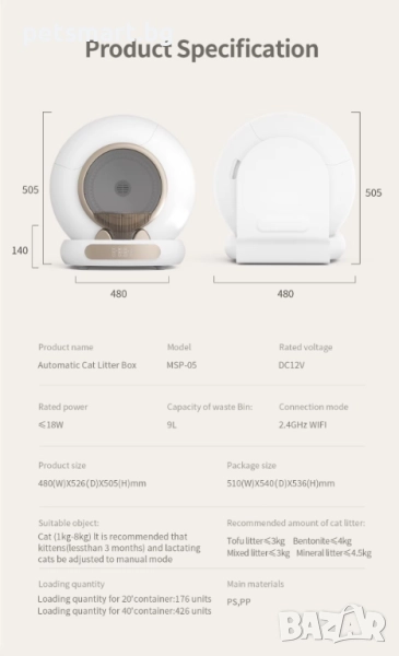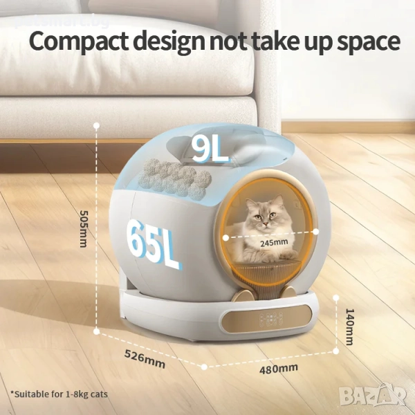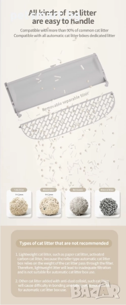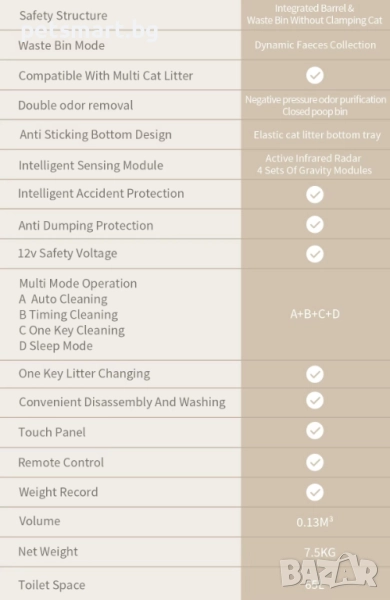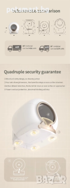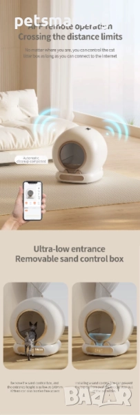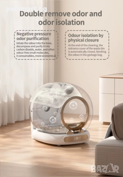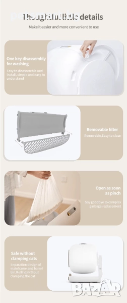 Автоматично почистване — след като котката използва кутията, вграден механизъм ще отдели отпадъците и ще ги премести в контейнер, без да е необходимо ръчно вадене на екскременти.