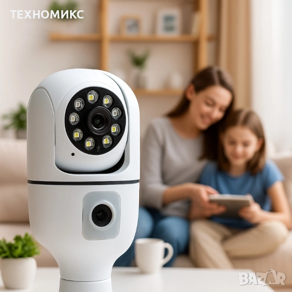 Ако се притесняваш, че домът или офисът ти остава без надзор, докато си далеч, тази WiFi безжична въртяща се двойна IP камера за фасунга е твоето моментално решение – монтираш я за секунди на мястото на обикновена крушка (Е27) и веднага имаш пълен контрол и наблюдение в реално време, където и да се намираш. С Full HD 1080P картина, 8 LED светлини и инфрачервено нощно виждане ще виждаш всяко движение дори при пълна тъмнина, а двупосочният звук ти позволява не само да слушаш, но и да говориш през камерата. Сигурност, която се включва като лампа, без кабели, без майстори и без сложна инсталация.