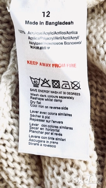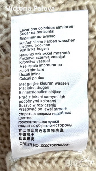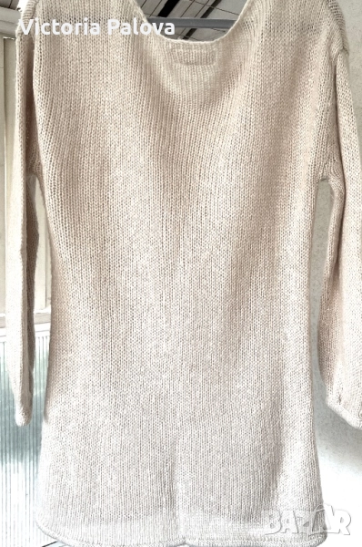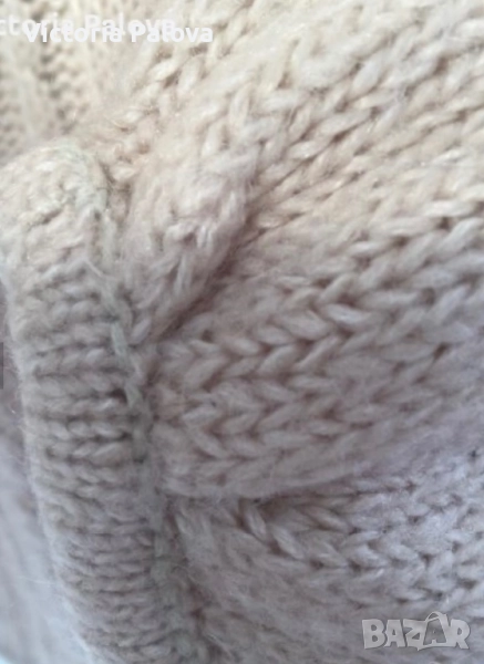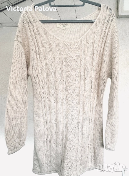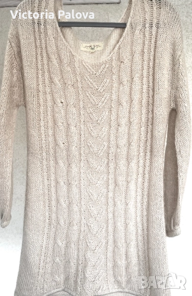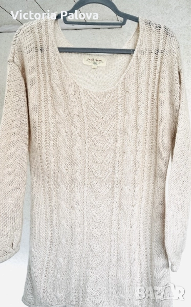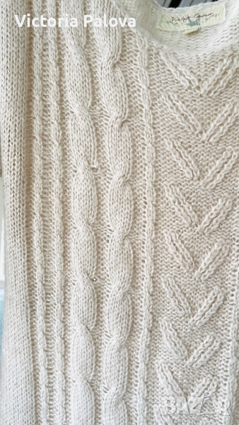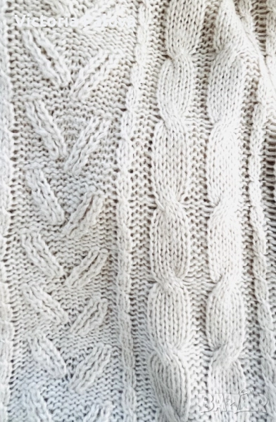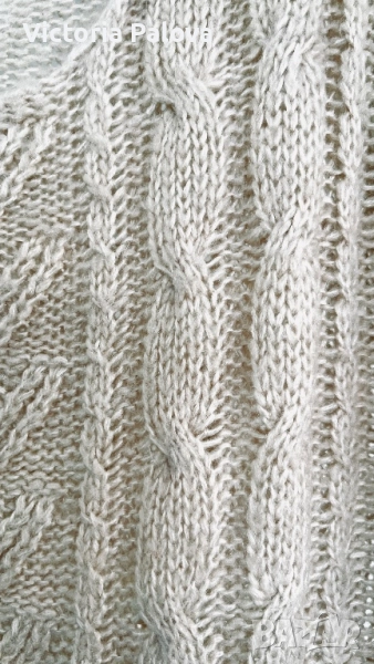 Този пуловер е истинска класика - с изтънчен плетен релеф от плитки и V- образен мотив по средата, който издължава силуета и придава шикозна визия. Цветът екрю е универсален и изключително подходящ за есента и зимата - нежно се комбинира както с дънки , така и с пола или панталон/клин. Съставът е акрил - мек, топъл, лесен за поддръжка. VINTAGE COUTURE е марка, съчетаваща ретро елегантност и комфорт. Рамо - 60см, ГО -54см, дължина - 79см, ръкав - 56см.