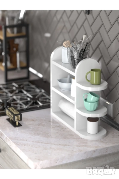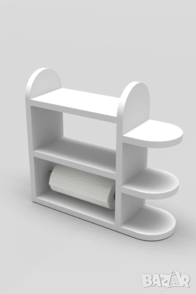 • • Две функции в едно – горните рафтове са идеални за подправки, буркани и кухненски принадлежности, а долната част е специално проектирана като поставка за кухненска ролка.