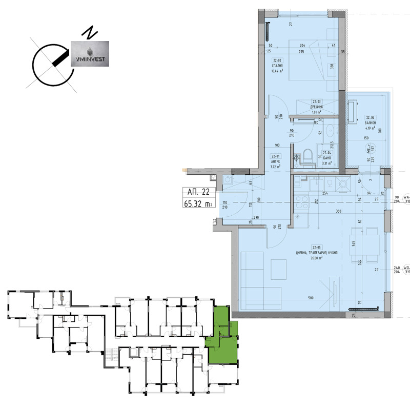 Апартаментът /Ап.22/ е с площ от 79,13 кв.м. и е на трети етаж.