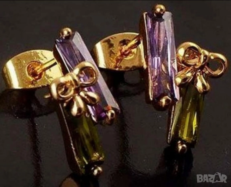 Обеците са изящни, изключително прецизно изработени. Представляват 1:1 това, което се вижда на снимката. Интересна е комбинацията на зелен и виолетов цирконий, както и панделката встрани.