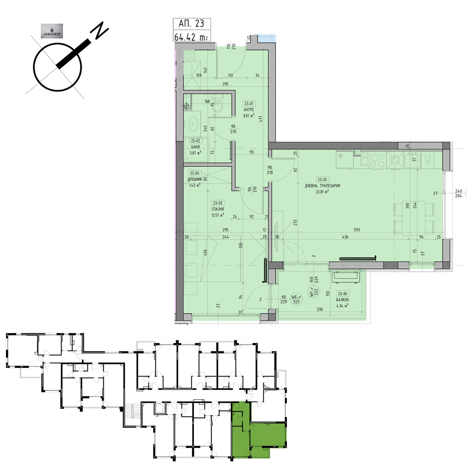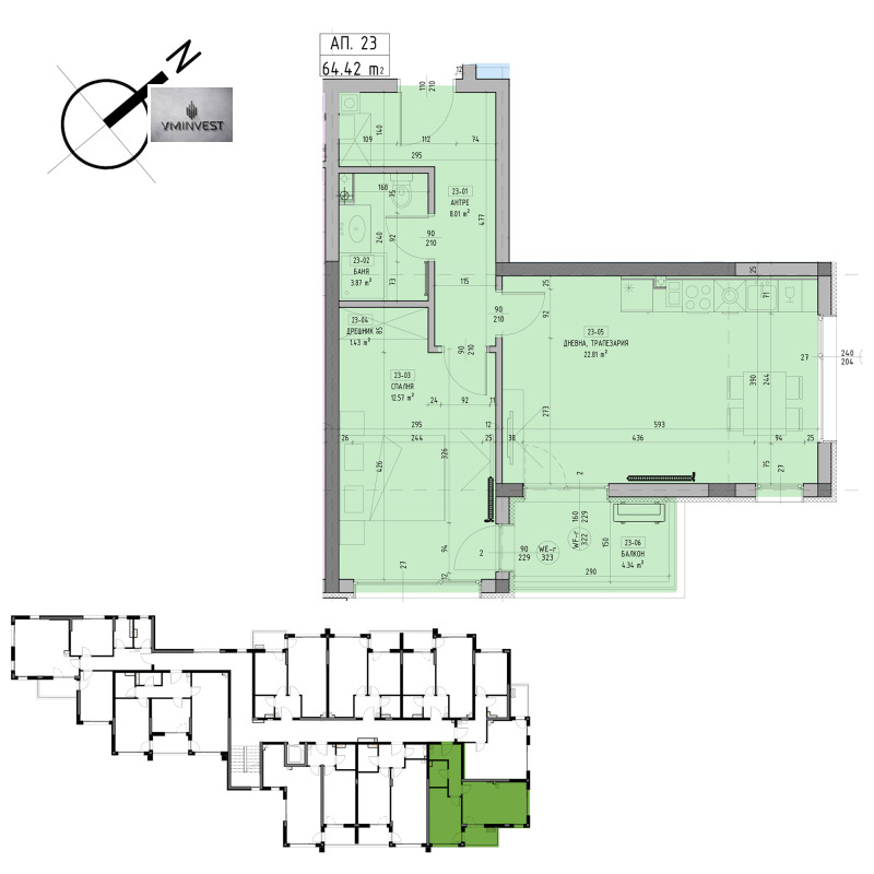 Апартаментът /Ап.23/ е с площ от 78,73 кв.м. и е на трети етаж.