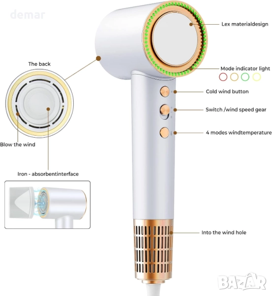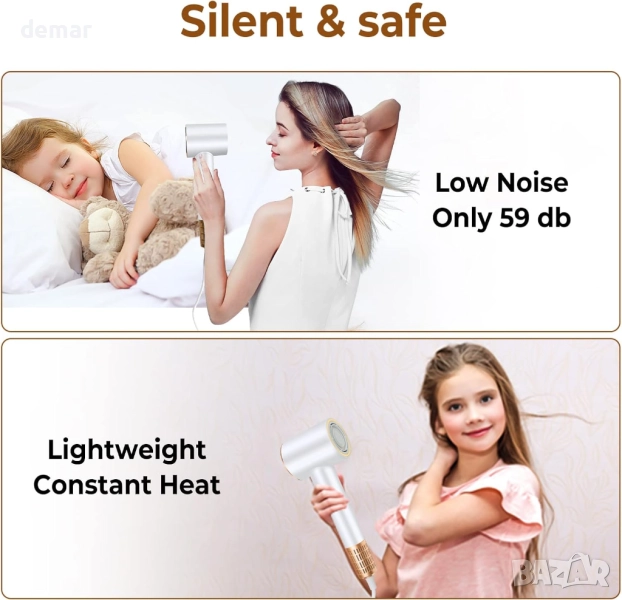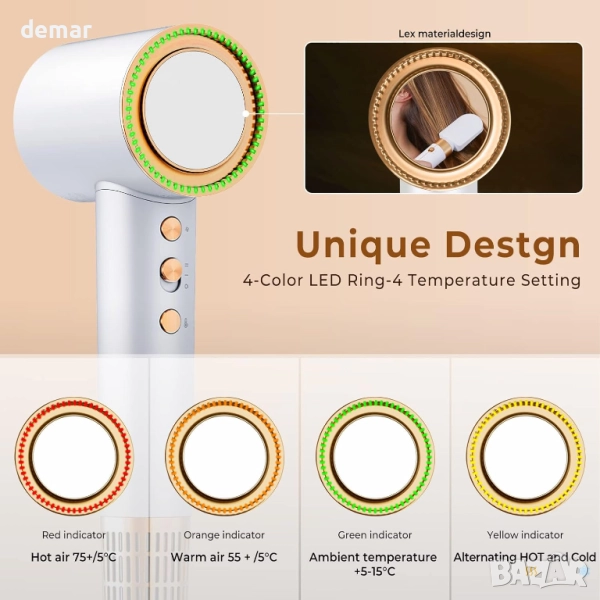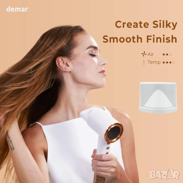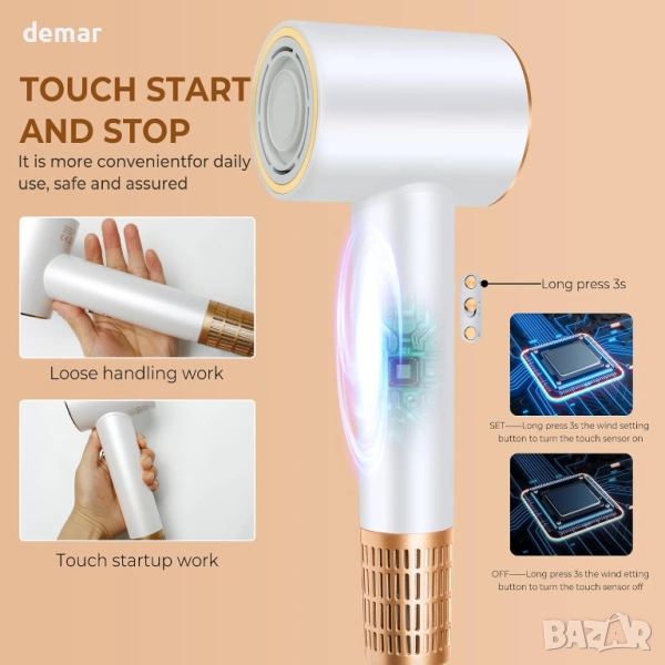 Този сешоар осигурява ултрабързо сушене само за минути с висока скорост, което го прави подходящ за употреба у дома или при пътуване. Той разполага с йонна технология и постоянен контрол на температурата, за да намали къдренето, да предпази косата и да я поддържа гладка и здрава, като същевременно предлага четири настройки за топлина и две скорости, подходящи за всички типове коса. Дизайнът с ниско ниво на шум осигурява по-тиха работа, а въртящата се на 360° магнитна дюза и предпазен филтър го правят лесен и безопасен за цялото семейство, включително деца. Интелигентен сензор за докосване в дръжката позволява автоматично стартиране и спиране за допълнително удобство.