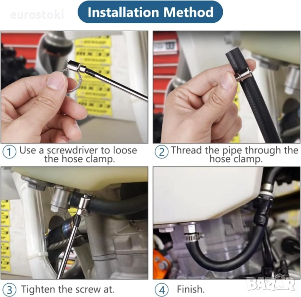 Ще получите горивна тръба с дължина 1 м, вътрешен диаметър 5 мм и външен диаметър приблизително 11 мм, както и 6 допълнителни скоби за маркучи от неръждаема стомана.