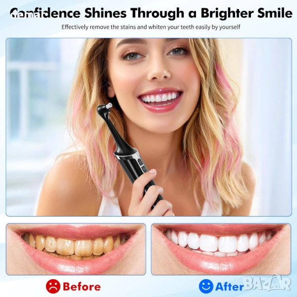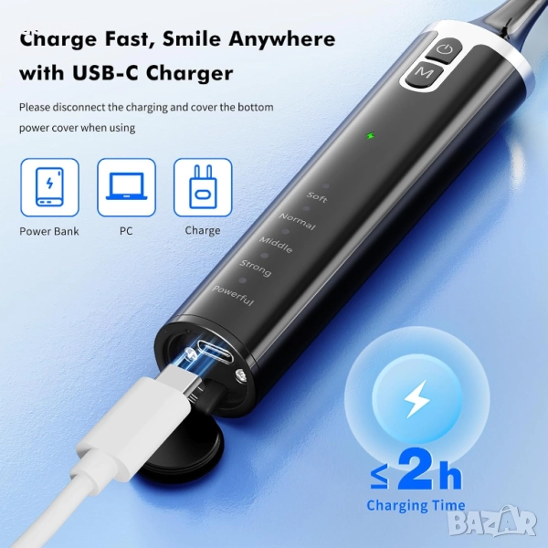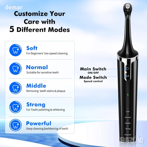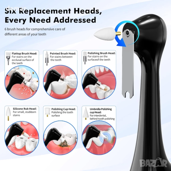 Това устройство предлага шест сменяеми почистващи глави за цялостна дентална грижа, с пет регулируеми режима на интензивност, подходящи за различни нива на чувствителност. Вградената LED светлина подобрява видимостта по време на употреба, а водоустойчивостта IPX6 осигурява безопасна работа. Зарежда се бързо и ефективно чрез USB-C порт, а ергономичната черна дръжка с ясни индикатори за режими прави работата удобна и лесна.