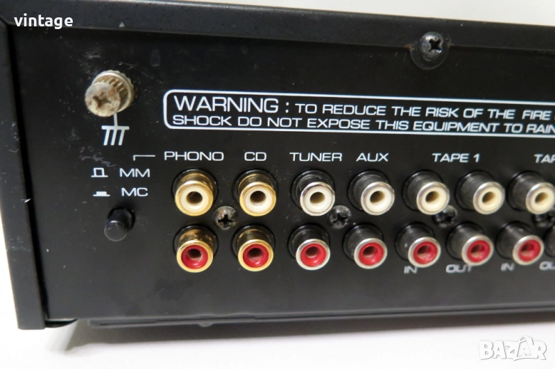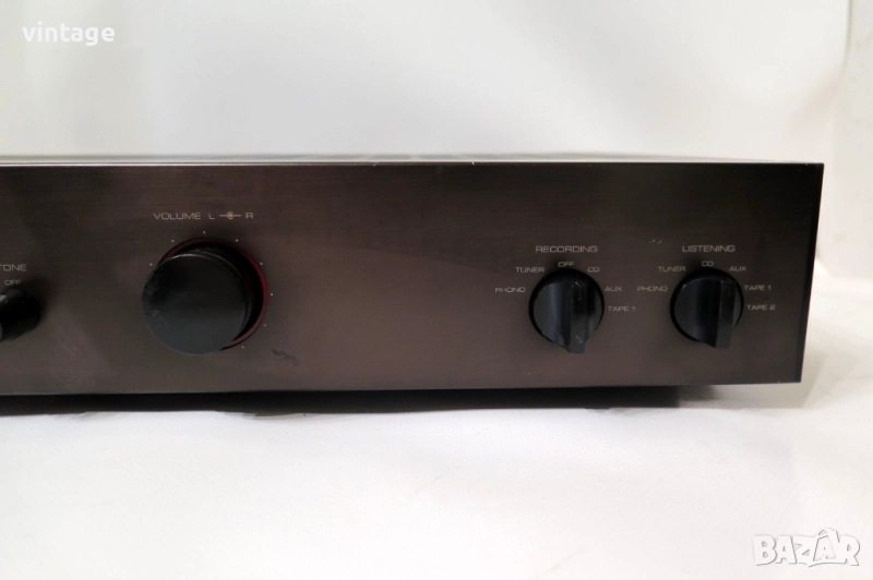 Транзисторен стерео усилвател, отличен технически, известни забележки по външния вид. Корекции: bass, treble. Много добър саунд. Приложените снимки и видео са реални!