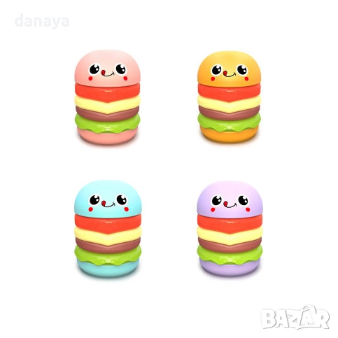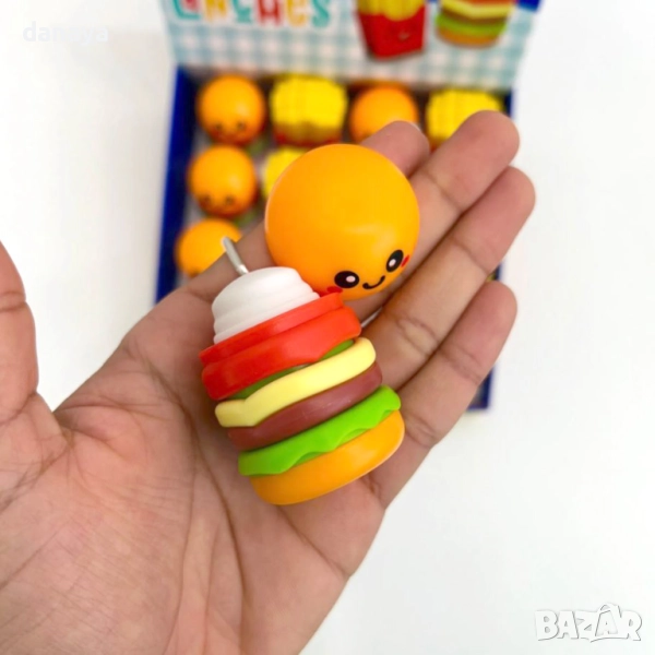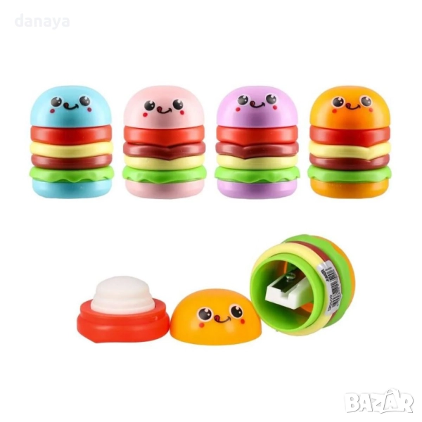 Забавна острилка с гума за моливи с форма на хамбургер – практичен и забавен аксесоар за ученици и творци. От едната страна е удобна гумичка за изтриване на грешки, а от другата – острилка за моливи. С форма на весел хамбургер в свежи цветове, този 2 в 1 продукт съчетава функционалност и забавление. Подходящ за училище, офис или за подарък.