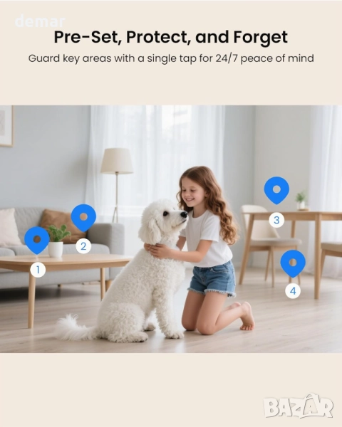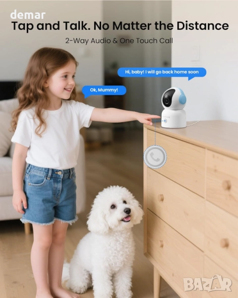 Тази вътрешна WiFi камера осигурява ясна 4K 8MP резолюция с поддръжка на 2.4GHz и 5GHz връзки за стабилно стриймване. Тя разполага с детектор на движение с интелигентно разпознаване на хора и 360° проследяване, изпращайки незабавни известия, когато бъде забелязана активност. Двупосочната аудио връзка ви позволява да говорите, слушате или да използвате бутона за повикване с едно докосване за директен контакт. Отдалеченият достъп позволява наблюдение от всяко място, с ясно инфрачервено нощно виждане до 10 метра. Записите могат да се съхраняват на включената 64GB карта памет (разширяема до 256GB) без месечни такси, с опция за съхранение в облак.