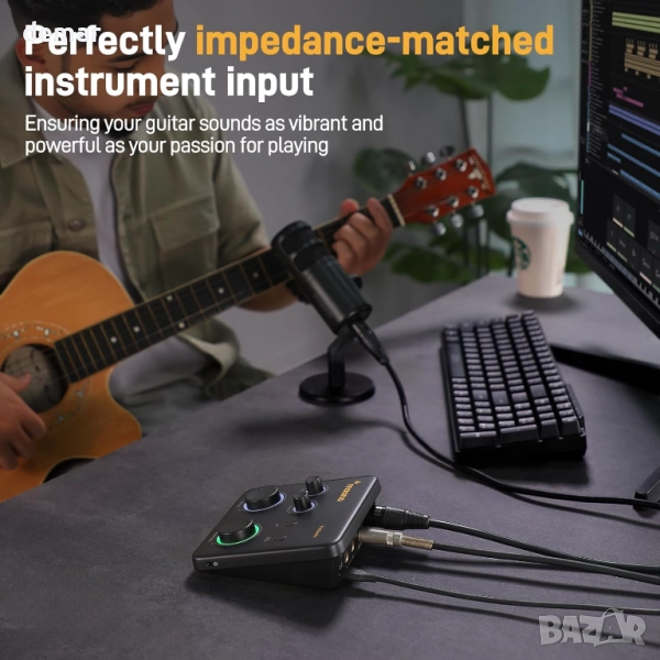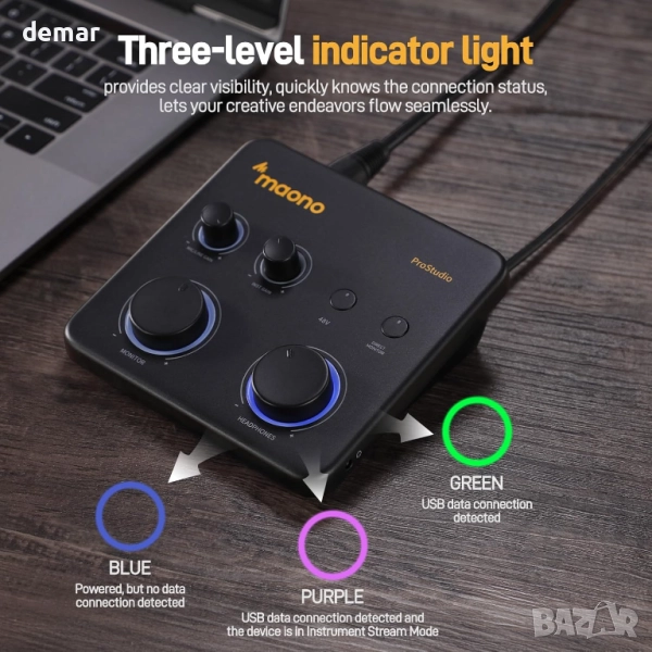 Аудио интерфейсът MAONO PS22 Lite осигурява запис с висока резолюция 24-битов/192kHz с динамичен диапазон от 106dB, поддържайки както кондензаторни, така и динамични микрофони с усилване на предусилвателя от 56dB и фантомно захранване от 48V. Той разполага със специален инструментален вход за запис на