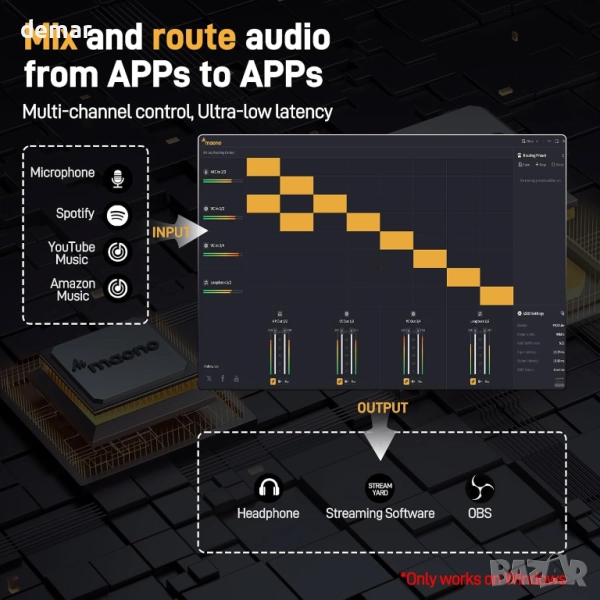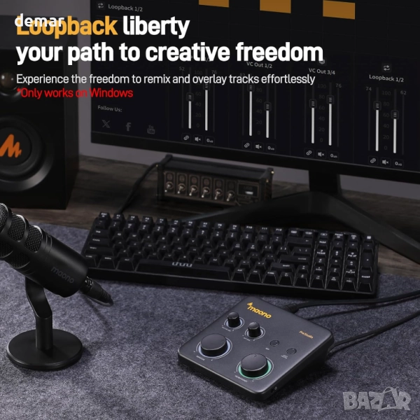 китара с регулируем импеданс и вградени ефекти, което го прави идеален за музиканти, подкастъри и актьори, озвучаващи музика. Включеният софтуер за маршрутизация ProStudio предоставя виртуални канали, loopbacks и ASIO съвместимост за гъвкаво стрийминг на живо с ниска латентност. Проектиран за начинаещи, той предлага интуитивни режими за запис, излъчване и инструменти, както и plug-and-play настройка и директен мониторинг за плавен творчески работен процес.