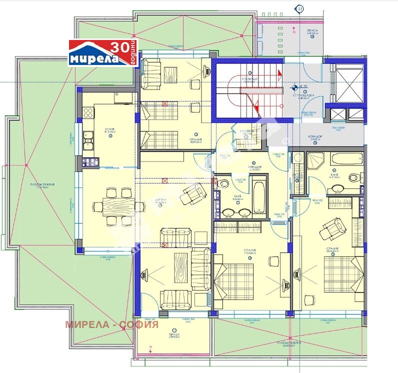 Функционално разпределение: три спални, дневна с кухня и трапезария, две бани, складово помещение и тераса 96.03 кв.м..
