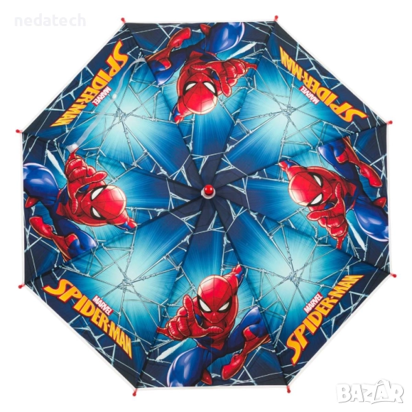 Чадър за дъжд за момче в син и червен цвят с дизайн Spiderman. С извита дръжка и механизъм за автоматично отваряне.