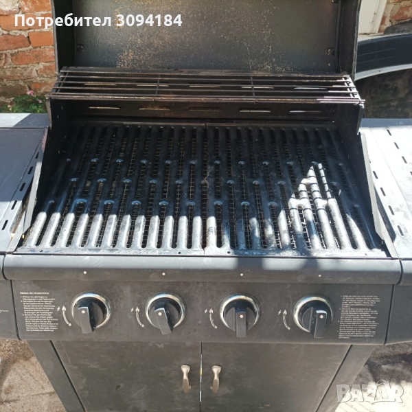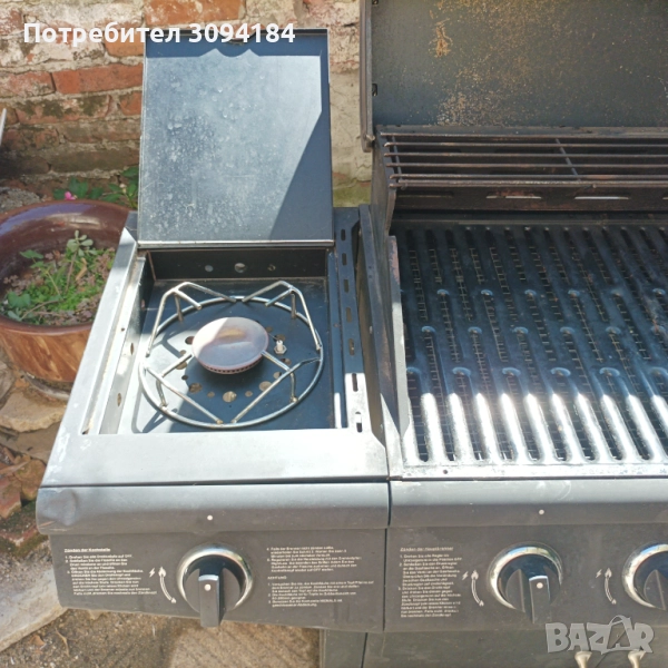 Продавам голямо газово барбекю с камъни от лава ,4 горелки,плюс газов котлон, част за печене на зеленчуци ,подходящ за готвене на открито. Корпусът е изработен от метал и отдолу има шкаф с две врати за съхранение на аксесоари. Барбекюто е внос от Германия, /камъните са чисто нови сменени/ . Използвано е, но все още в добра работна кондиция.