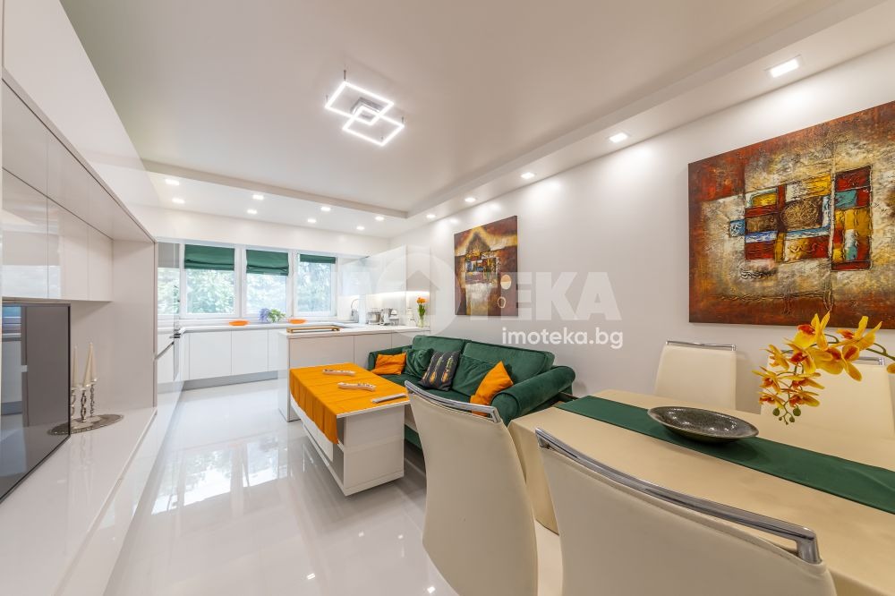 Дизайнерски обзаведен тристаен апартаменть най висок клас мебели и оборудване. Състои се от антре, хол с кухненски бокс и трапезария, две спални, баня с тоалетна, изцяло сменени ел. и ВиК инсталации, външна изолация.