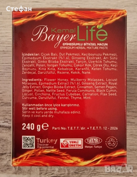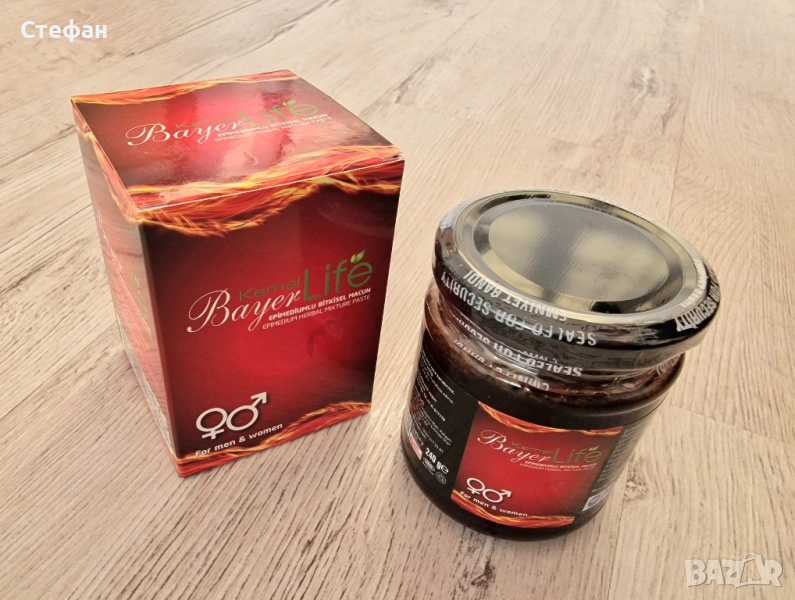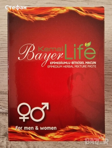 Възможно е лично предаване за град Пловдив. Kemal Bayer Life 240 грама - най новият турски маджун с 2х съдържание на активната съставка!!! Съдържание на епимедиум: 1,6% (2 пъти повече от другите предлагани на пазара!) Epimedyumlu Kemal Bayer LIFE Мacun е 100% натурален стимулант, създаден от даровете на природата. Epimedyumlu Macun увеличава желанието за секс и подобрява ерекцията като стимулира простатната функция и работата на тестисите. Epimedium повишава либидото, подобрява половата мощ и възстановява сексуалното желание. Епимедиум е билка, която открито се рекламира като най-мощният натурален сексуален стимулатор. В тази насока тя е доказала своята ефективност, дори и при тежки случаи със здравословни проблеми. Тя съдържа икариин, който е естествен аналог на силденафила – основната съставка на Виаграта. Но за разлика от виаграта растителното вещество икариин няма странични ефекти. Епимедиум дава бърз ефект и е един от най-продаваните продукти на световният пазар. Мъже-жени,стари и млади могат да го използват увеличавайки сексулната мощ и сексуалното си желание. Пастата Епимедиум може да помогне при проблеми с еякулацията. Разгонен козел, Епимедиум (Horny Goat Weed) е перфектната билка за вас и вашата половинка! Насладете се на нейната сила и съживете сексуалният си живот. Подобрява силата и потентността по естествен начин. Основният химичен състав на тази билка е икариин, който потиска ензима фосфодиестраза-5 и влияе на контрола на кръвообращението в половите органи. Билката е идеалният афродизиак, защото действа директно на еректилна дисфункция, като повишава либидото по естествен път. Билковата паста за показване на сексуална активност с екстракт от Епимедиум повишава мъжкото самочувствие и поддържа нормална сексуална активност при мъжете. Епимедиум е естествен афродизиак, който повлиява положително сексуалното представяне в случаите на еректилна дисфункция и преждевременна еякулация. Допринася за разширяване на кръвоносните съдове и увеличаване притока на кръв към пениса. Епимедиум е източник на икариин – активно вещество, съдържащо се в листата на билката, на което основно се дължи положителния й ефект върху сексуалната мощ. Икариинът е признат като №1 природно средство срещу еректилна дисфункция и слабо полово влечение. Някои спортни специалисти препоръчват епимедиум като средство за показване на силовите показатели и показване на мускулна маса. Епимедиум се препоръчва при: – Страдащи при импотентност. Подобрява качеството и количеството на сперматозоидите. – Преждивременна еякулация. – Страх и стрес по време на половият акт. – Дефицит по време на полов акт.Помощник в недостиг на енергия и умора. – За увеличаване на сперматозоидите. – За хора срещащи трудностти поради напредване във възрастта. – Нормализиране на кръвното налягане,подобряване на пикочно-половата система, също така се препоръчва при проблеми с простата, повишаване на мускулната сила и физическа издръжливост. Укрепителен агент, който повишава ефективността и устойчивостта на организма към стрес и физическо натоварване.. Приложение: * При по-редки полови контакти се препоръчвa половин кафена лъжица (желателно дървена или пластмасова, не използвайте метални) от пастата 30-45 минути преди акта. Състав: Епимедиум- 1,6 %, пчелно млечице, мед от цветя, глюкоза, черница-сироп, рожков, черен кими