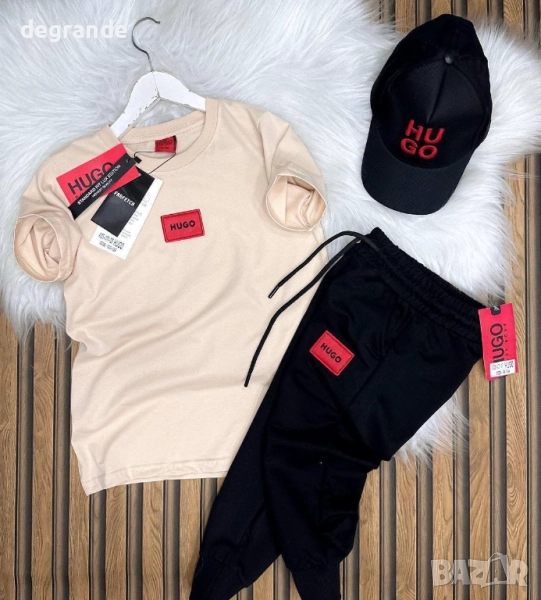 Комплект за момчета от 3 части Hugo- панталон с тениска и шапка.