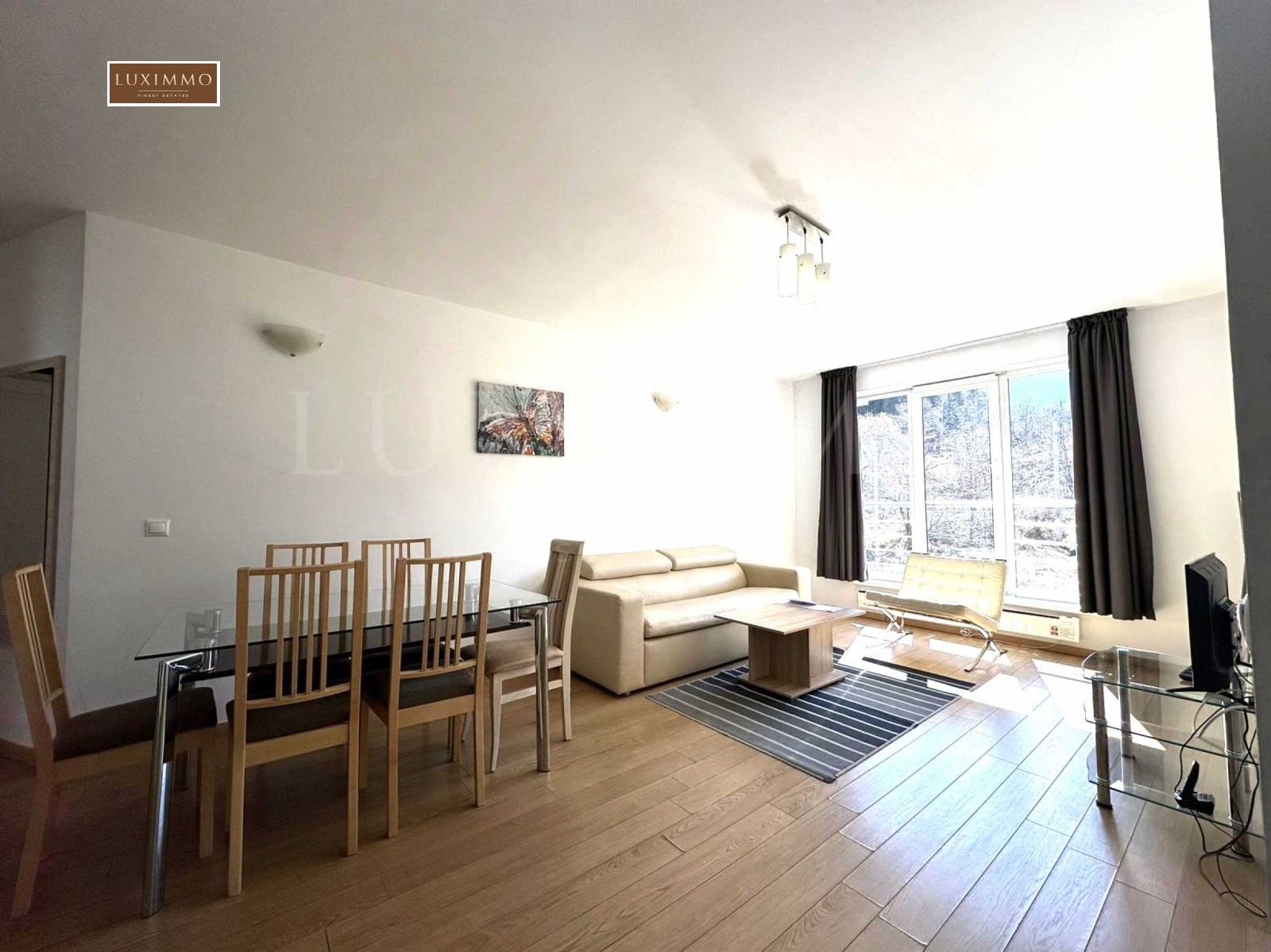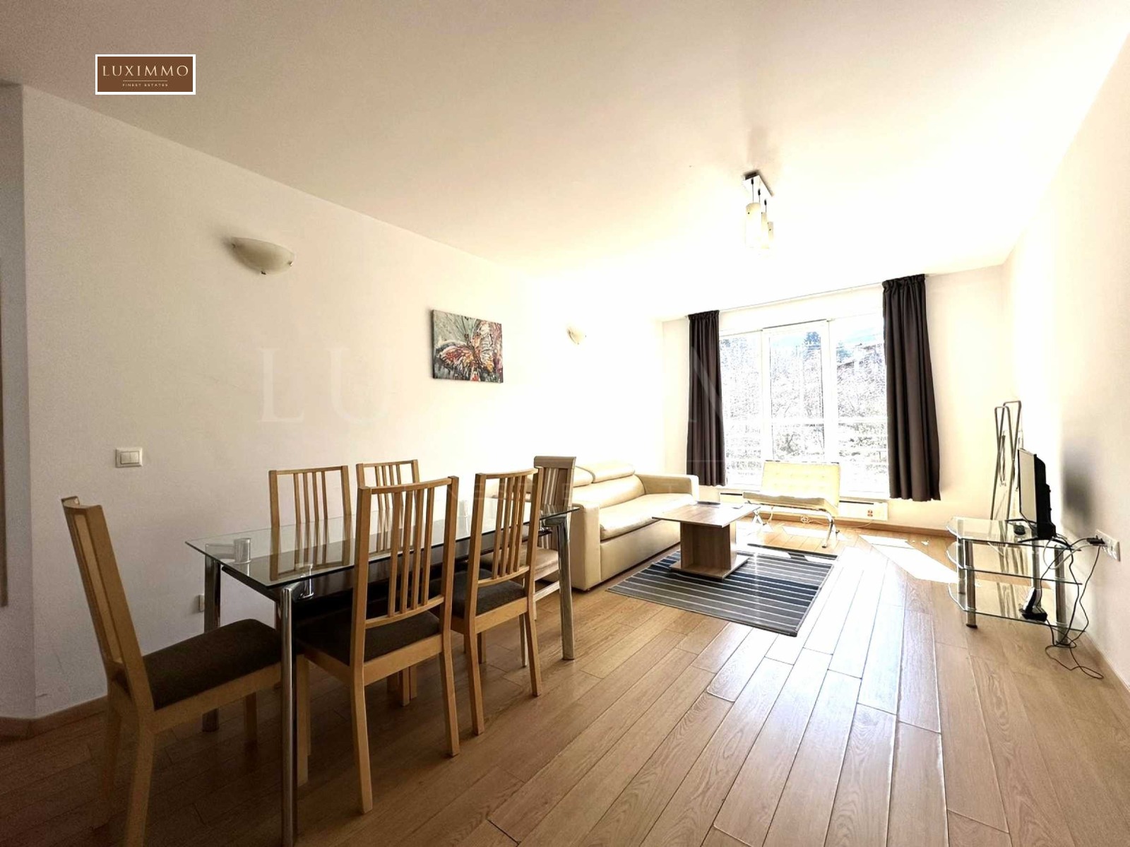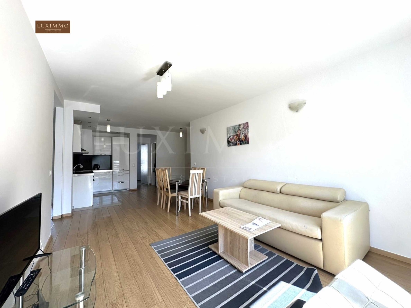 Жилището е с индивидуален дизайн, с голямо внимание към детайлите. В декорацията са използвани само най-висококачествените и естествени материали. Просторната всекидневна разполага с мека мебел и бяла кухня, която е напълно оборудвана с висок клас техника: фурна, котлони и хладилник.