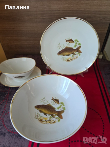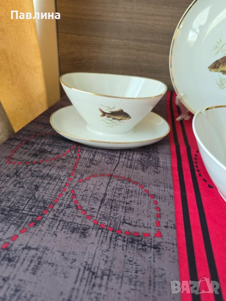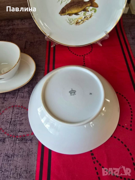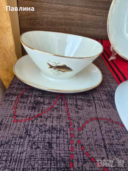 Комплект от порцеланово плато - диаметър 23 см., купа с диаметър 23 см. и дълбочина 7 см. и сосиера. Цената за комплекта . Има маркировка за произход.- 65 лева.