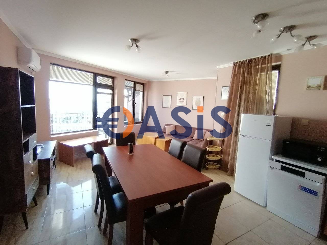 Тристайният апартамент се състои от: антре,просторна всекидневна,съчетана с кухненски бокс, две спални, отделно тоалетна и баня, тераса с изглед към морето . От терасата има фронтална гледка към морето, басейна, озеленената територия на комплекса .Панорамата на морето се отваря не само от терасата ,но дори и от кухнята, всекидневна и от коридора . Апартаментът е с изглед от 2 страни, от спалните има изглед към планината . Апартаментът е уютен и светъл, оборудван с всички необходими мебели и уреди :