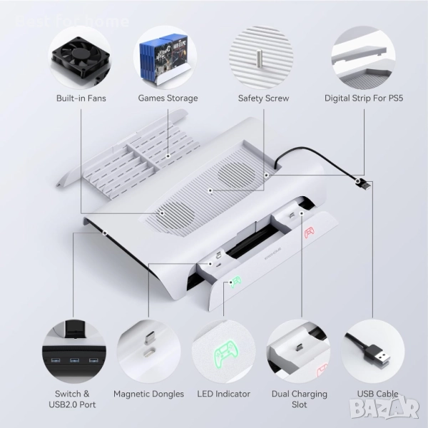 【Охлаждаща стойка с RGB за PS5 версия】Проектирана за PS5 Disc & Digital Edition, разполага с 2 вградени вентилатора за охлаждане с 3 регулируеми скорости, двойни зарядни станции за контролери, 8 ярки RGB режима, 10 игрови тави, 3 2.0 USB порта, USB-C кабел, 2 магнитни Type-C адаптера, охлажда конзолата ви и поддържа всичко по-организирано, чудесен подарък за фен на PS5. Долният охлаждащ вентилатор не е включен. Забележка: НЕ е за PS5 Slim.