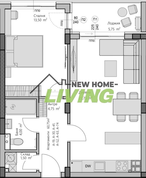 Разпределение: дневна с кухненски кът и трапезария, спалня, баня с тоалетна, склад и тераса.