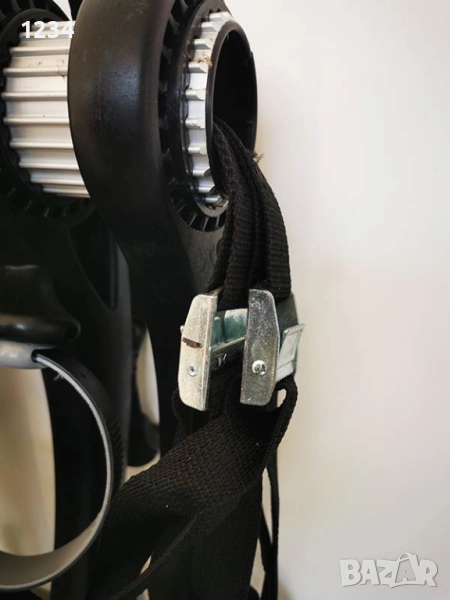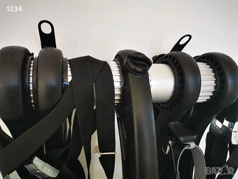 Окомплектована с всичко необходимо за монтаж - колани, скоби и т.н. Скобите са с гумирано покритие за да не нараняват боята на автомобила.