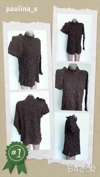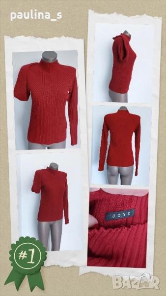 1️⃣. Колаж / M / 3XL - "Joyx". Цената е крайна, без пазарлъци 19,99лв / 10 евро. Хипереластична блуза / пуловер с високо бие - полуполо, реглан ръкави. Цвят "Бордо", декорацията е дискретна плетеница. Дрехата е изтънчена и покрива дрескода за офис. Поради голямата еластичност покрива няколко размера от М до 3ХЛ - вижте еластичността. Без дефекти.