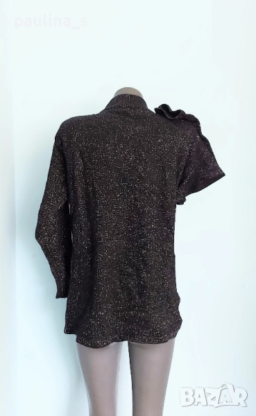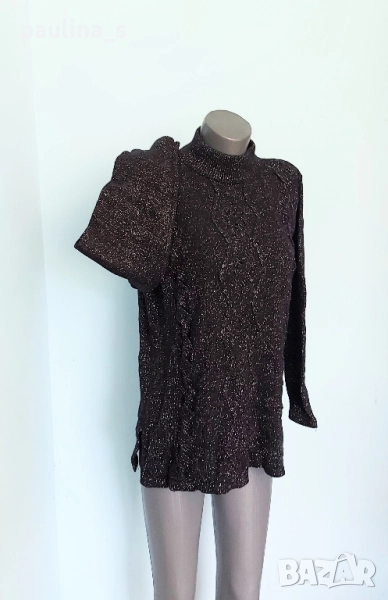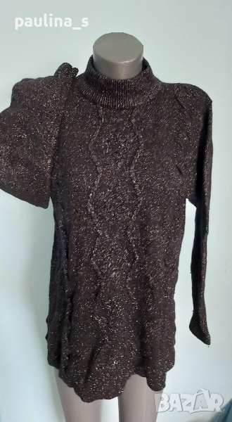 2️⃣. Колаж / L / 2XL - Черна вълнена туника тип издължен пуловер с ламена нишка в преждата и плетеници. Цената е крайна, без пазарлъци 29,99лв / 15 евро. Дрехата е много топла, а на светлина блести в сребърно. Голям размер с цепки отстрани, висока яка, стои добре и е дискретно елегантна. Взет от фабриката Яна Плевен, без етикет, преждата съдържа вълна и ламе, леко боцка. Без забележки, без дефекти и етикет със състава.