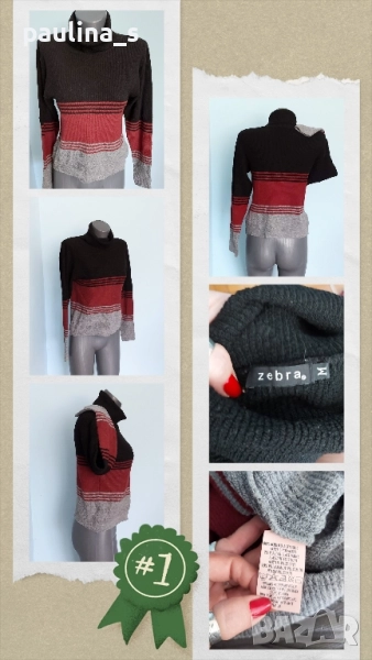 4️⃣. Колаж / L / 3XL - "Zebra". Цената е крайна, без пазарлъци 19,99лв /10 евро. Хипереластичен пуловер с поло яка. Покрива няколко номера, поради голямата еластичност. Моделът е стандартен цветовете се преливат на райета.