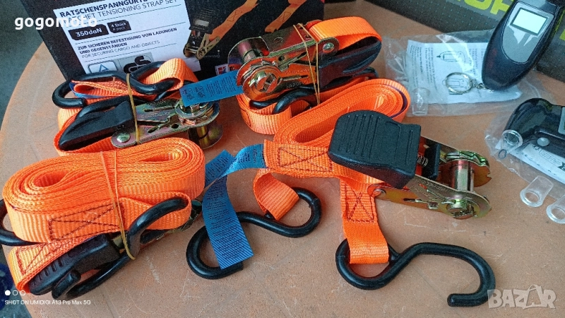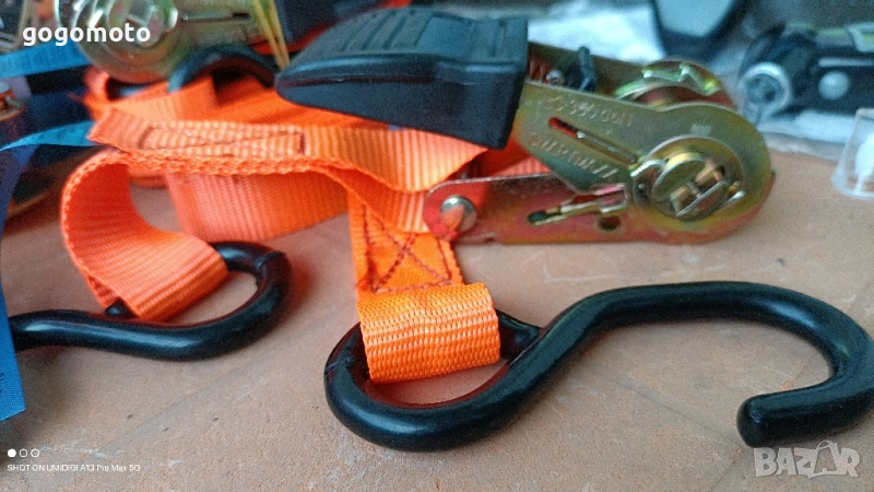 Колани с тресчотка, За укрепване на товари, Дължина 4.1 метра, Товароносимост 700 кг, Цената е за брой. Подходящи за укрепване на превозвани стоки, допълнителна безопасност за превозни средства, превозвани на платформата, багаж, транспортиран над колата, велосипеди, ски или други превозвани предмети.