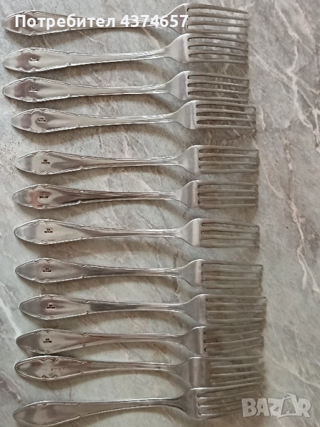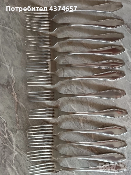 Прибори за хранене от неръждаема стомана. Произведени преди 1990 г. Малко използвани в отлично състояние. Всички са маркирани. 1. 12 бр. Големи лъжици, дължина 21,5 см. 2. 12 бр. Големи вилици, дължина 20 см. 3. 12 бр. Малки лъжички, дължина 14 см. Цената е за брой.