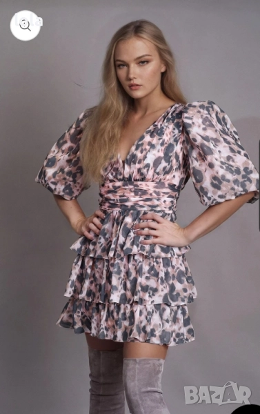 разкроена рокля с три волана и буфан ръкав.