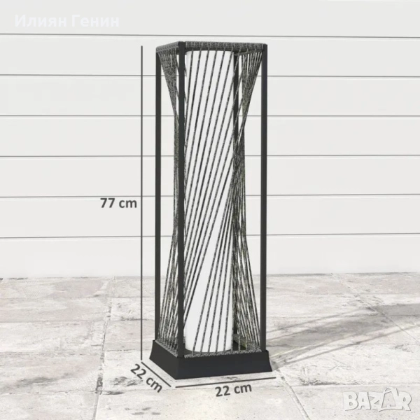 Размери на външната лампа: 22Д x 22Ш x 77В см. Соларен панел: 12Ш x 12Д см. Водоустойчивост: IP44.