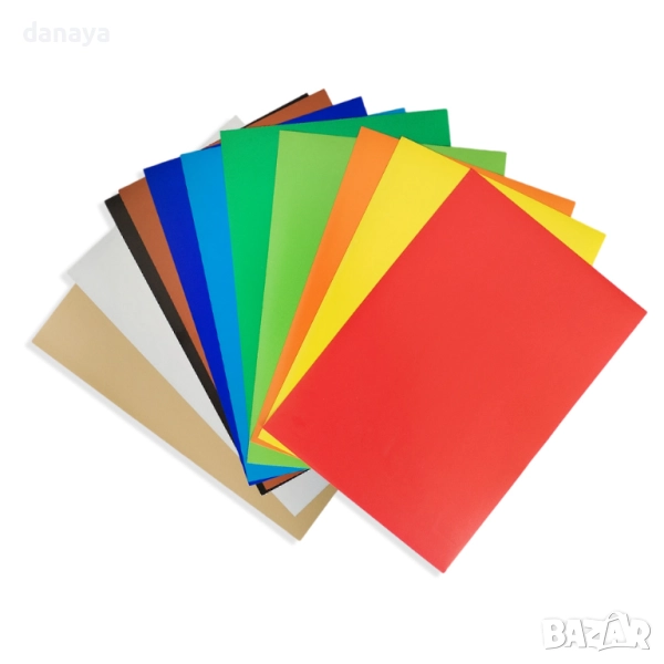 Самозалепваща цветна хартия, 10 цвята. Комплект от 12 самозалепващи се гланцови цветни листи с формат B5. Хартията е гланцирана, в разнообразни 12 цвята, и е поместена в удобна картонена папка, която я предпазва и улеснява съхранението.