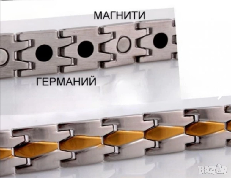 Изработена е от хипоалергична медицинска неръждаема стомана, не потъмнява и не се променя. Съчетанието на златисто със сребристо я прави уникално красива!Лечебното й действие се дължи на оптималното съчетание на вградените неодимови магнитни и германиеви дискове със сложно разпределени полюси, които създават постоянно, близо до естественото земно магнитно поле с доказано лечебно и профилактично действие, без вредни ефекти. То действа върху хемоглобина на непрекъснато преминаващата през ръката кръв, обогатява я с кислород, подобрява кръвообрaщението и в един по-дълъг период регулира кръвното налягане. Постоянното носене на гривната отмива холестероловите плаки по стените на съдовете и свежда до минимум вероятността от хипертонична криза. Има и болкоуспокояващ ефект в областта на ръката, на която се носи - при схващания, мускулни проблеми, ревматоидни процеси, ставни болки, плексити, възпалителни процеси.При постоянно носене тя регулира кръвната захар, размива камъни в бъбреците и жлъчката, подобрява дейността на стомашно-чревния тракт, облекчава умората, намалява отоците. С магнитната гривна може да се намагнитват течности - вода, чай, мляко и др. Гривната се нанизва върху бутилка с течност и за около час течността се йонизира, намагнитва се. С магнитна вода се отслабва напълно здравословно, повлиява цялостното тонизиране на организма. За да има добър и траен ефект, гривната трябва да се носи постоянно. Разбира се, от нея не могат да се очакват вълшебни неща. Тя е просто едно разумно допълнение към прилаганата терапия, като в определен момент е възможно да я намали или дори замести.Сила на магнитното поле 2500--3000 GaussПроникване на магнитното поле 30-40 мм