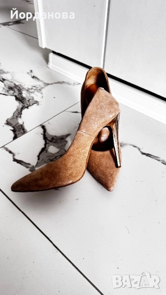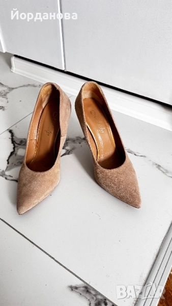 Дамски обувки на висок ток 9см от естествена кожа -велур. Много са мекички, но се налага да ги продам, защото след 2-3 обувания започнаха да ми се вадят. Аз съм с тънък и дълъг крак.