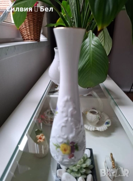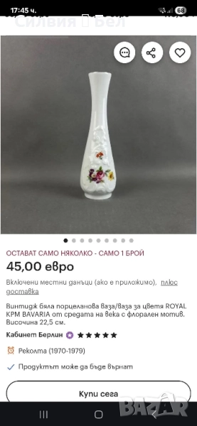 Изящна порцеланова ваза с ръчно рисувани цветя и златен кант - 20 см. ೋ🌷 ೋ🌷 ೋ🌷 Royal KPM Handarbeit Porcelain ೋ🌷 ೋ🌷 ೋ🌷 Потопете се в очарованието на тази великолепна, порцеланова ваза, която е истинско произведение на изкуството. Висока 20 см, тя е перфектното допълнение към всеки елегантен интериор. Златен кант, който обгръща върха й, придава допълнителен блясък и изтънченост. Ръчно рисуваните цветя, разположени от всички страни на вазата, са истинска наслада за окото. Всеки детайл е изрисуван с прецизност и любов, което прави тази ваза уникална и неповторима. Изработена от висококачествен порцелан, тя е не само красива, но и здрава и устойчива. Нейната изящна форма и елегантни линии ще добавят стил и класа към вашия дом. Тази ваза е идеална за поставяне на любимите ви цветя, но също така може да бъде и самостоятелен декоративен елемент. Тя е перфектният подарък за любителите на изящните предмети и за всеки, който цени красотата и елегантността. * Височина: 20 см * Материал: Порцелан * Декорация: Ръчно рисувани цветя, златен кант. * Състояние: Отлично. ೋ🌷 ೋ🌷 ೋ🌷 Цена 5️⃣0️⃣лв. 《25,56 €》 Не пропускайте възможността да притежавате тази уникална ваза, която ще внесе красота и елегантност във вашия дом! Марката "Royal КРМ" се отнася до "Königliche Porzellan-Manufaktur Berlin" (Кралска порцеланова манифактура Берлин). Това е един от най-известните и престижни производители на порцелан в света, с богата история и традиции.