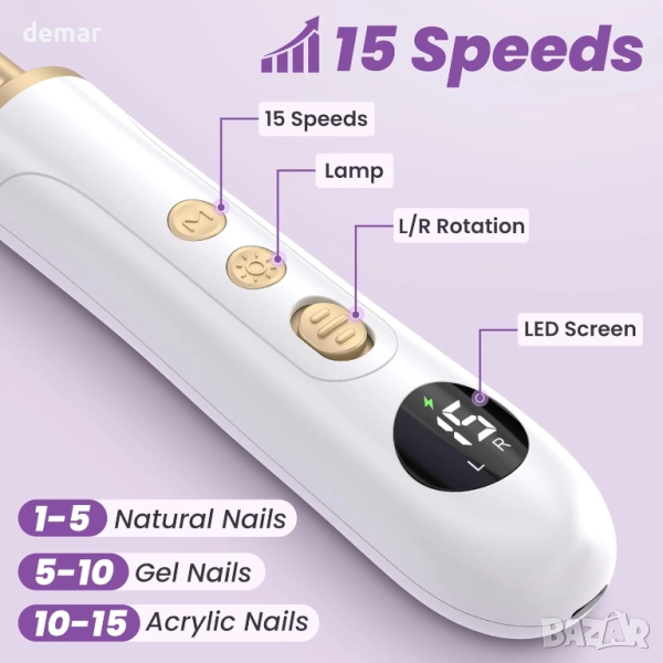 Електрическа безжична пила за нокти с 15 скорости и LED светлина