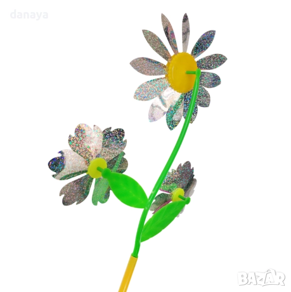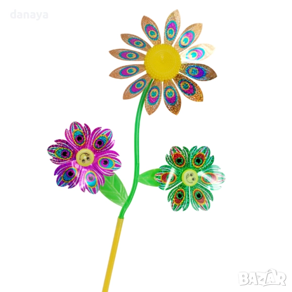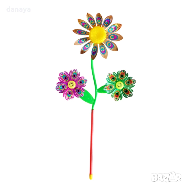 Блестяща вятърна въртележка с 3 цветя – красив и забавен аксесоар за градината или двора. С височина 59 см, тази цветна въртележка се върти плавно при лек вятър и добавя оживление и настроение на всяко място. Изработена от леки и устойчиви материали с блестящи детайли, които улавят слънчевата светлина. Идеална за декорация на градината, терасата или за подарък за деца и възрастни.