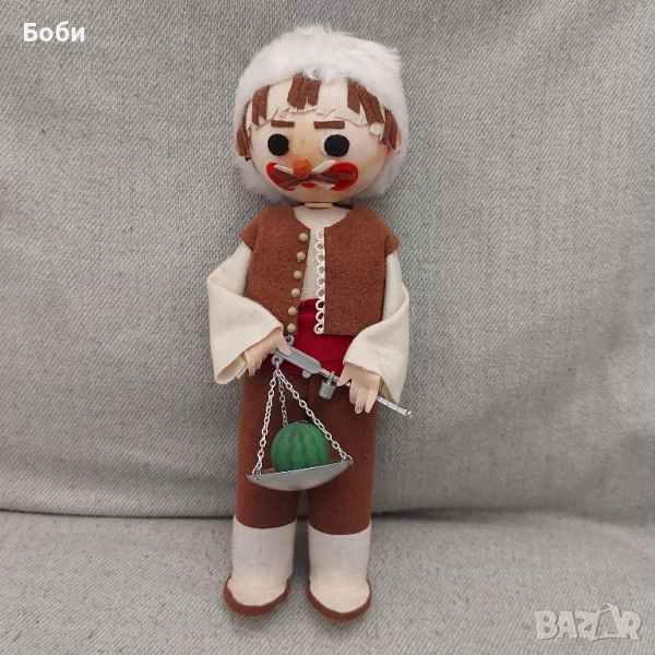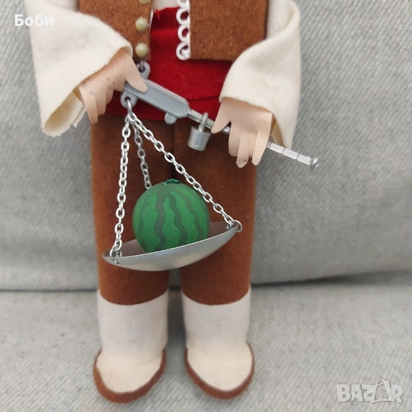 Стара Рядка Соц Българска Битова Голяма Кукла Продавач на диня Височина 34см С оригиналната кутия. Липсва единият капак на кутията. Дръжката на кантара е леко счупена. В добро състояние.